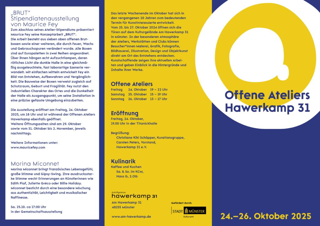 Das letzte Wochenende im Oktober hat sich in den vergangenen 20 Jahren zum bedeutenden Termin für Kunstinteressierte entwickelt. Vom 24. bis 26. Oktober 2025 öffnen sich die Türen auf dem Kulturgelände Am Hawerkamp 31 in Münster. In der besonderen Atmosphäre der Ateliers, Werkstätten und Clubs können Besucher:innen Malerei, Grafik, Fotografie, Bildhauerei, Illustration, Design und Objektkunst direkt am Ort des Entstehens entdecken. In der einzigartigen Atmosphäre zeigen Kunstschaffende ihre aktuellen Arbeiten und geben Einblick in die Hintergründe und Inhalte ihrer Werke.